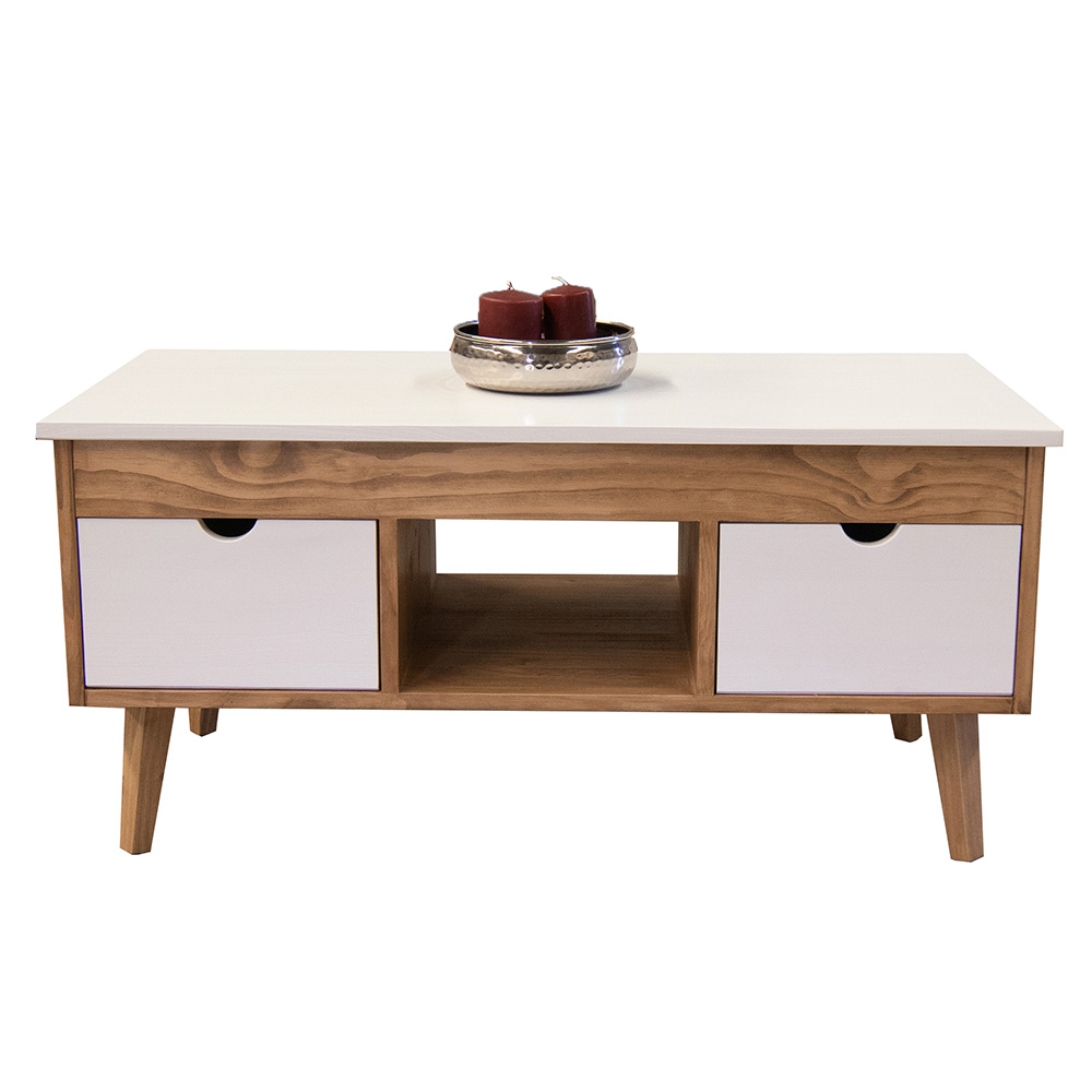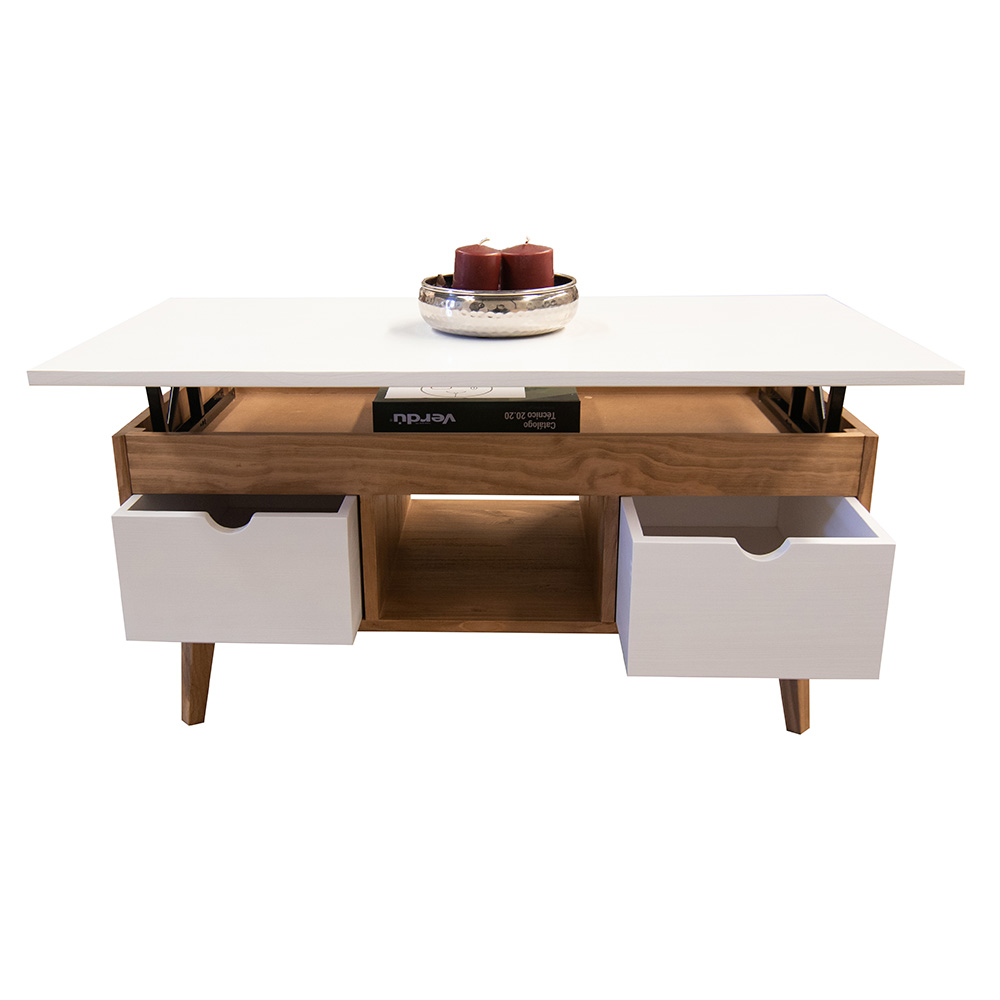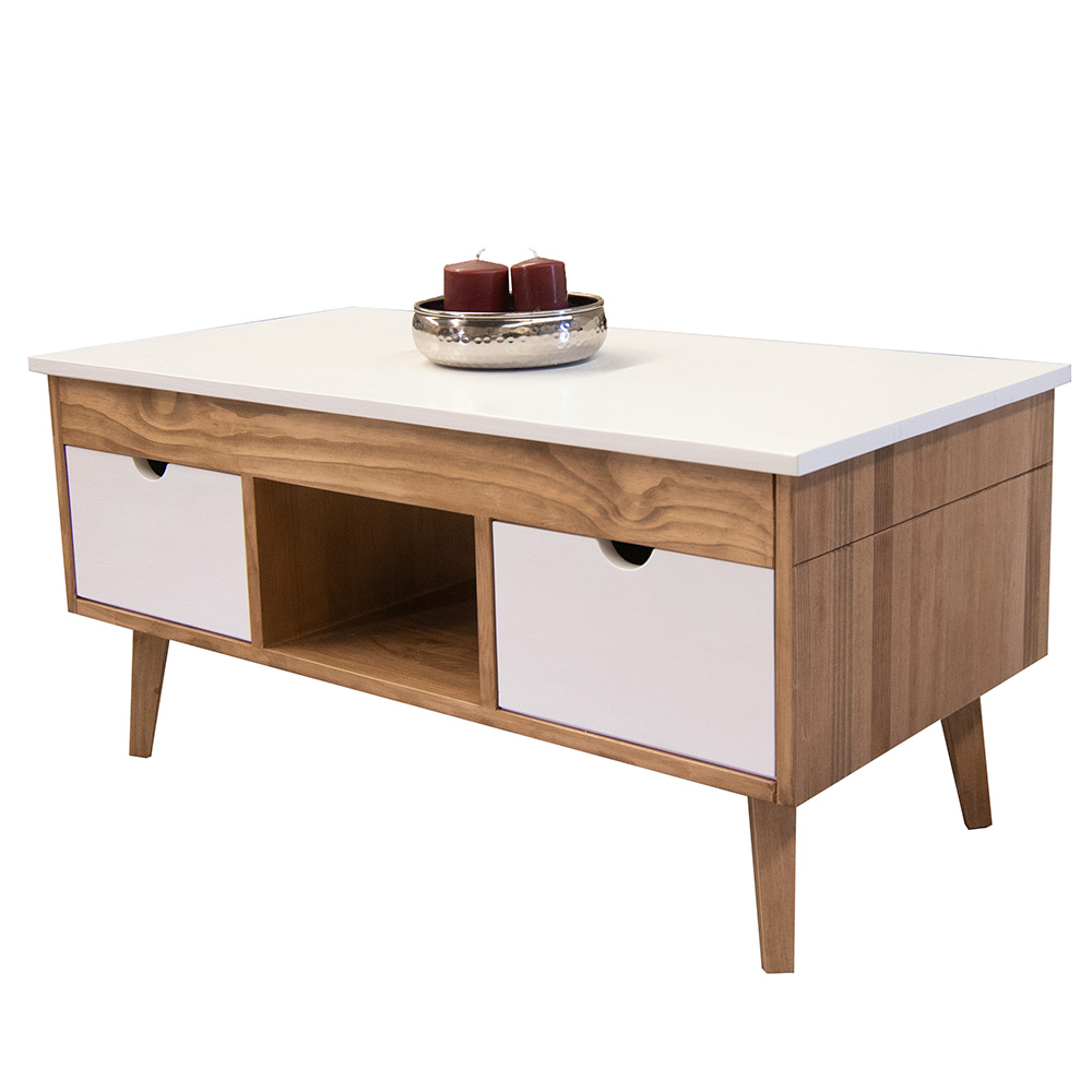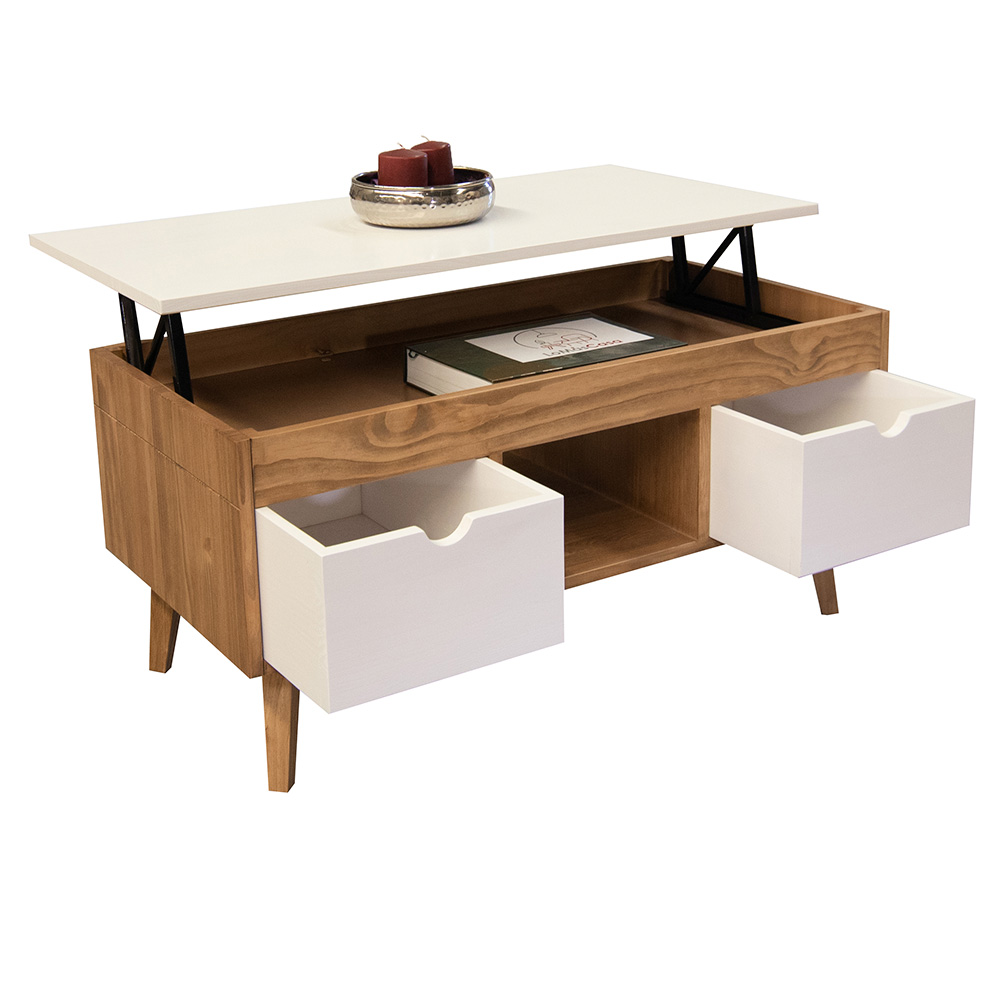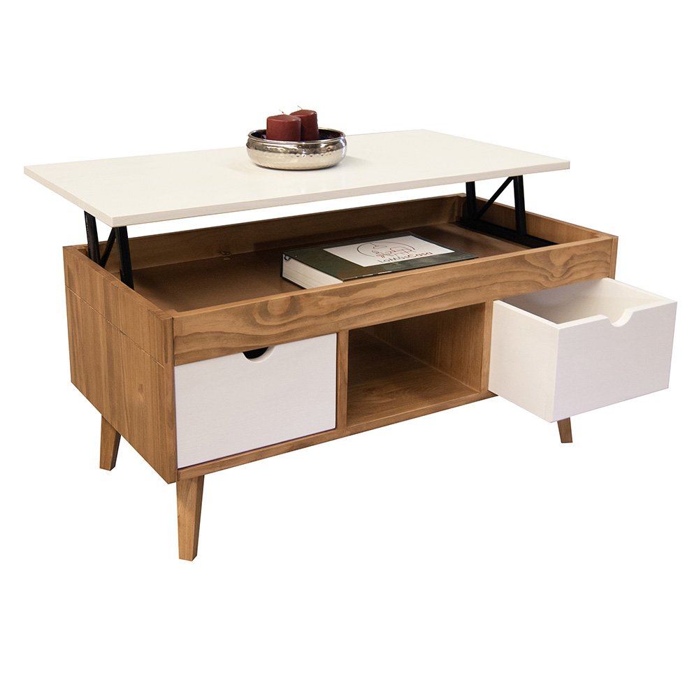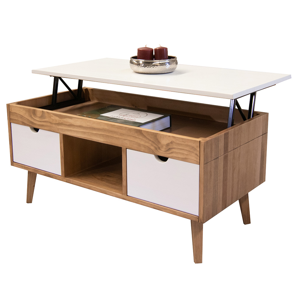 - MATERIALES: La mesa elevable de centro está fabricada en madera maciza de pino natural.