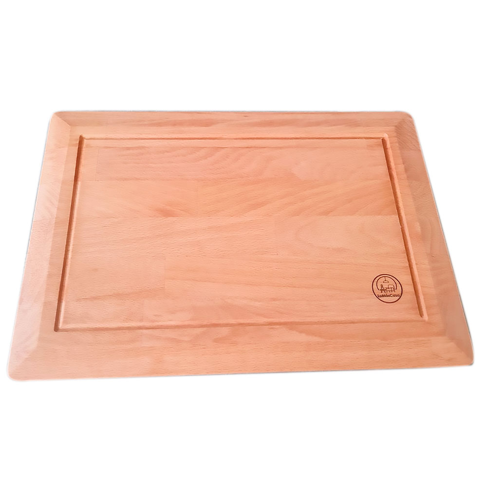Por una cara con una ranura para retener líquidos y la otra cara lisa lo que la hace versátil, una para cortar y la otra como bandeja para servir aperitivos.